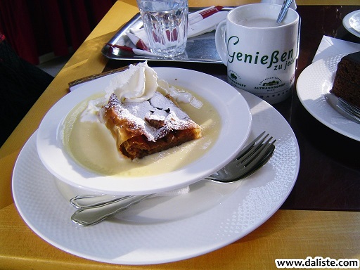 Што се тиче још слаткиша, обавезно треба пробати и штрудлу са јабукама у ванила сосу са сладоледом (Apfenstrudel mit Vanille und Eis). Најбоље место за то је дворац Шенбрун, односно Gloriette Cafe који се налази на врху брда. Штрудла је одлична, а поглед фасцинанатан. Ако је дан без кише и чак са само мало сунца вреди видети цео Шенбрун, а онда се и мало осладити уз бечку кафу Меланж. Cafe Landtmann је још једно од места где је треба попити.